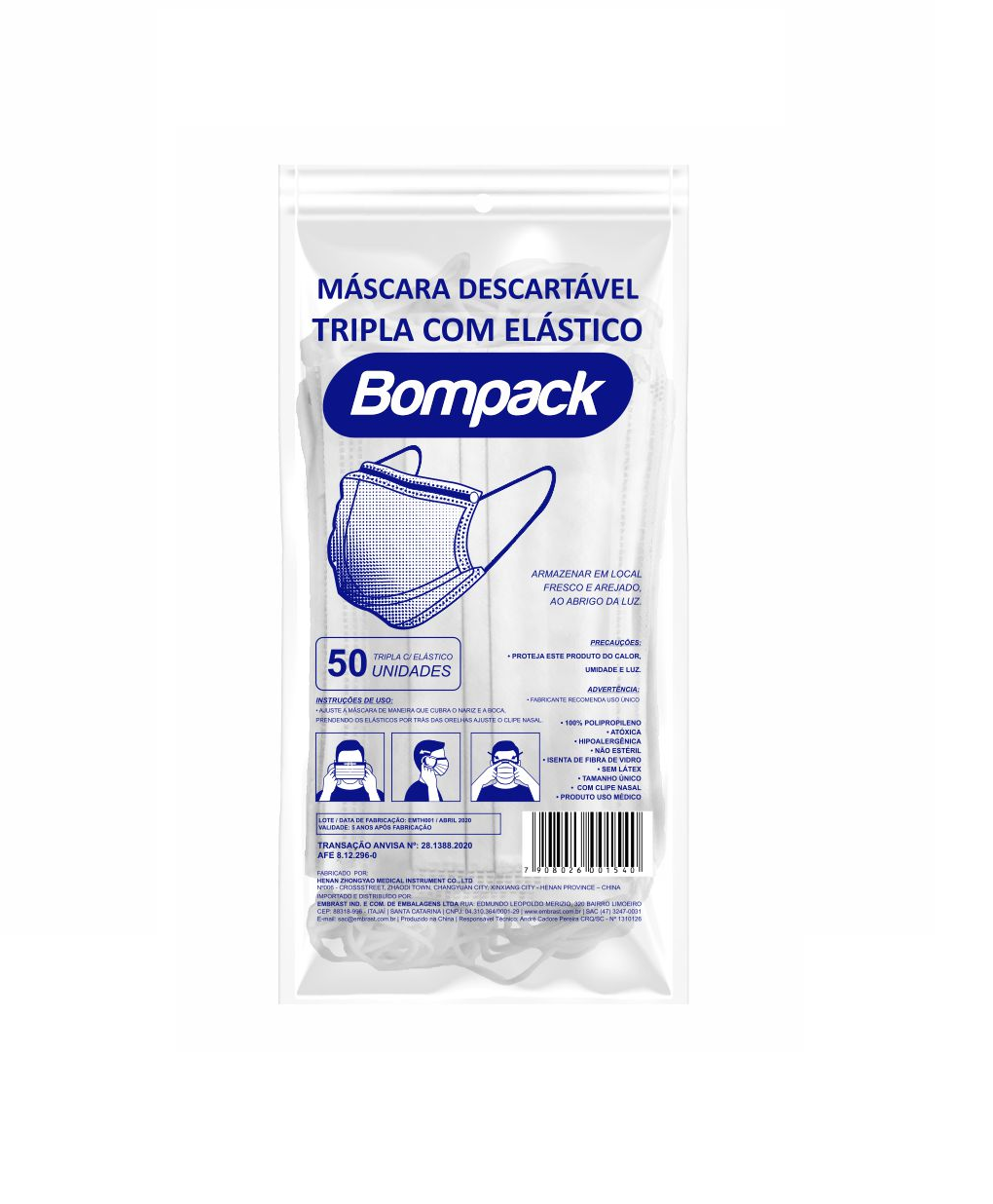 Máscara descartável tripla com elástico.
